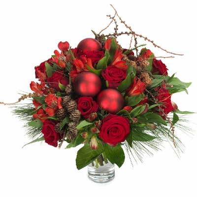 Schöner Strauß mit roten Blumen, der sagt: "Jetzt ist Weihnachten da!" Dekoriert mit leuchtend roten Weihnachtskugeln und saisonalem Grün. **Vase ist nicht enthalten.